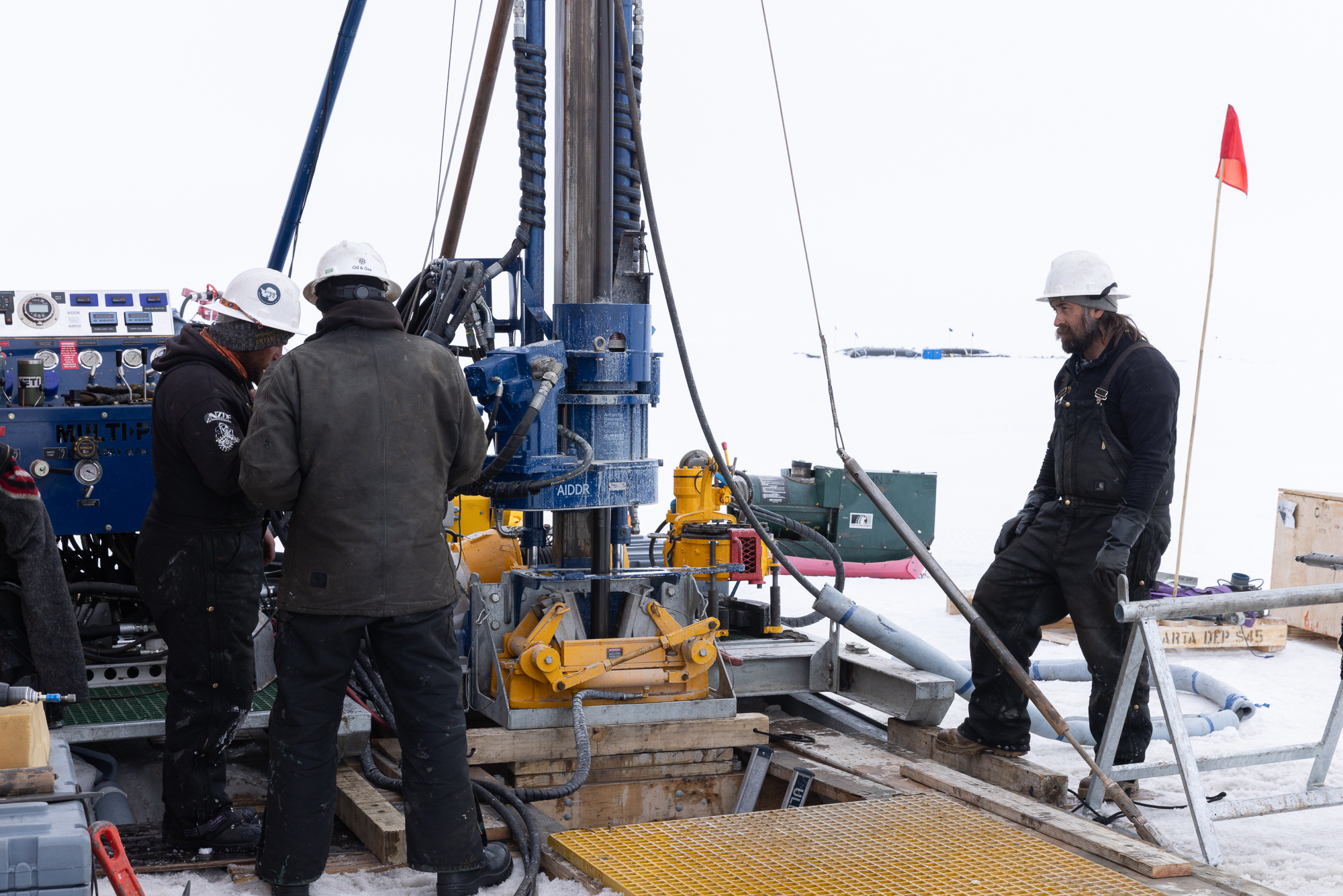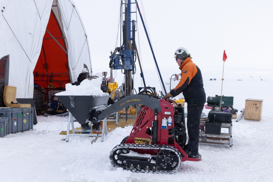 The rig sits on flitch beams, and with melting occuring during some warm days, and the weight of the drill string, it had sunk a little into the firn (the snow layer at the top of the ice sheet). The team lifted the rig and added blocks to make everything level and ready to go again. It was also an opportunity to freshen up the snow around the rig to remove any icy patches and fill any holes.