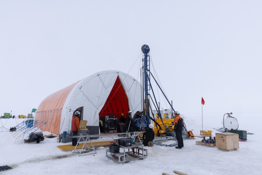 The SWAIS2C day shift awoke to fog today, making it hard to differentiate between the snow and the sky. It was a successful day’s drilling, with some long cores pulled up. The team had to pause to relevel the Antarctic Intermediate Depth Drill rig.